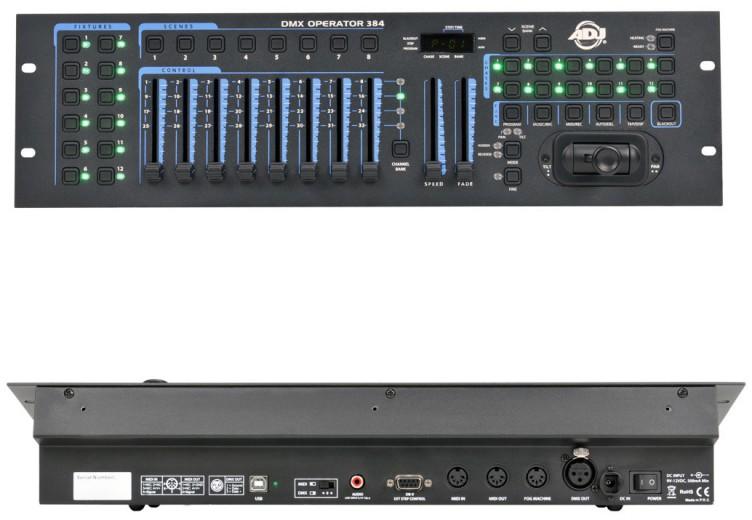 DMX Fényvezérlő - Univerzális DMX-512 fényvezérlő - 384 csatorna vezérlésére - 12 egység x 32 csatorna - 8 Fader + Fade és Speed Fader - Joystick  - 30 Program Bank, 8 Scene/Bank - Auto / Music vezérlés - Beépített mikrofon, RCA Line in - 12 Chase - Chase vezérléshez Tap Sync gomb - Black Out gomb - MIDI kompatibilis - RS-232 input - DMX out: 3p XLR - Mérete: 133 x 483 x 64 mm - Súly: 2,3 kg