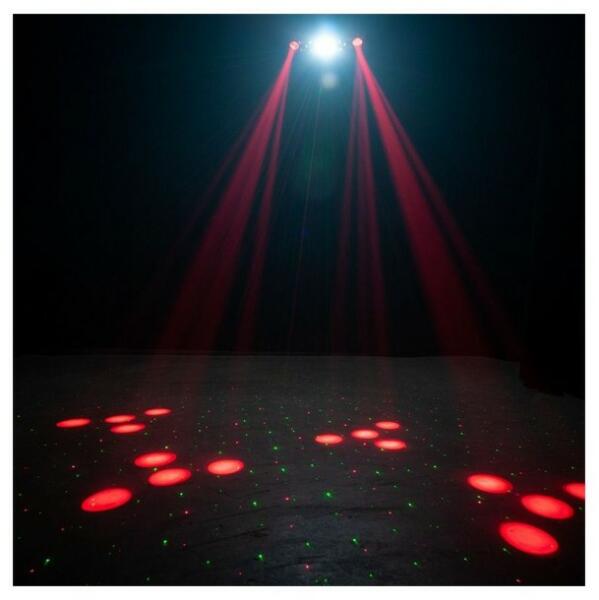Ledes Multi fényeffekt, Lézer, UV, LED, Stroboszkóp - 5 efffekt egy készülékben - Sztroboszkóp: 81 SMD 5730 fehér LED - 4 x 3W UV CREE LED - 6 x 3W Quad (RGBW) LED - 2db Lézer dióda: Piros = 100MW és Zöld = 70MW - Derby effekt: 5 mm LED RGBW (16x piros, 12x zöld, 12x kék, 16x fehér) - 4 működési mód: Automatikus, DMX, Sound Active és Primary/Secondary - Beépített mikrofonon keresztül hang vezérlés - 0-100% lineáris dimmer - Teljesítményfelvétel: 60W - 2 DMX csatorna mód: 11 vagy 24 csatorna - Feszültség: AC110-240V 50/60Hz - Készülék méretei: 457 x 178 x 165 mm -  Súly: 3,6 kg - Lézer engedélyszám: 2110902-000 - CE minősített