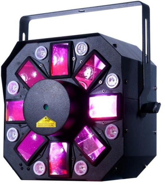 Ledes fényeffekt - Nagy teljesítményű 3 az 1 fényeffekt: Moonflower, Stroboszkóp és Lézer effekt, 6 x 5W-os (RGBWYP) HEX LED-el + 8 x 3W-os UV LED - 10 DMX Csatorna - 3 üzemmód: hangvezérel, Master/Slave vagy DMX - Beépített programok - 15 előre beállított szín - Linkelhető 3 pólusú XLR kábellel - 4 gombos kijelző - Stroboszkóp & Pulse LED Effekt - DMX-512 Protocol - Dimmerelhetőség: 0 - 100% - IEC AC ki/bemenet a hátoldalon (láncba fűzhető) - Biztonsági szem a hátoldalon - Fogyasztás: 70W - 100V~240V, 50/60Hz - Hosszú élettartalmú ledek (~50,000 óra) - Fény forrás: 6 x 5W RGBWYP (Piros, Zöld, Kék, Fehér, Sárga & Pink) LED-ek + 8 x 3W fehér LED + Piros és Zöld Laser - Méret: 304x230.5x9.75mm - Súly: 5kg