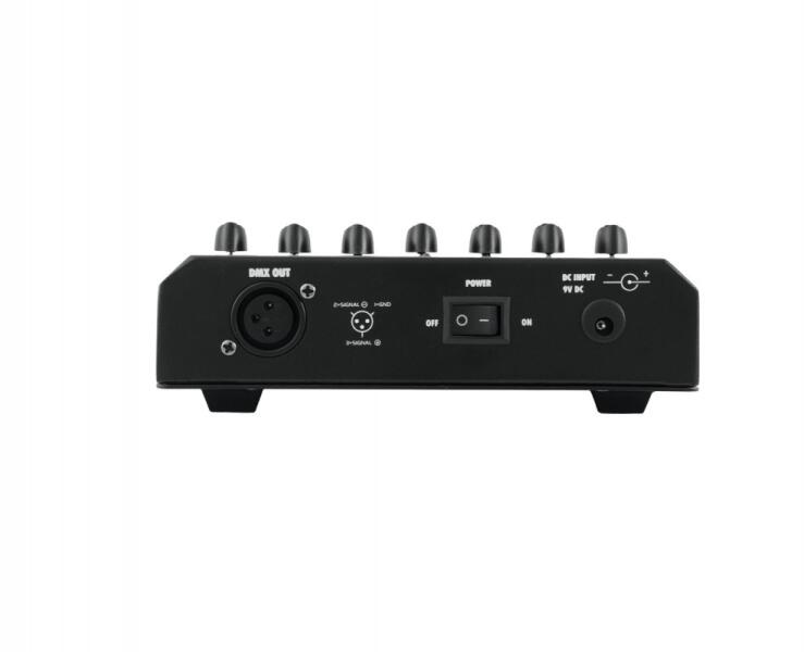 6 csatornás DMX vezérlő - 6 csatornás DMX vezérlő - 6 csatorna + 1 Master potméter - DMX kimenet: 1db 3p XLR - Tápellátás: 9V adapter vagy elem - Méret: 17x15,5x6cm - Súly: 0,96kg