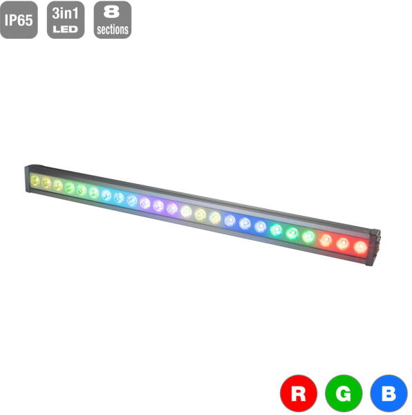 A LedBar 243 RGB IP egy nagyon strapabíró, tizennyolc részből álló LED sáv, IP65 vízálló osztályú. 24 kiváló minőségű LED-del felszerelve, biztosítva a sima RGB színkeverést. A készülék alumínium házzal, passzív hűtéssel, beépített hermetikus DMX csatlakozókkal, IN/OUT tápkábellel és dupla fogantyúval rendelkezik, tökéletes állandó világítási telepítésekhez. Ezen kívül ez a LED sáv számos vezérlési módot tesz lehetővé: DMX512, Hangvezérlés, Auto vezérlés, Master-slave, és fix megvilágítási szöge egyenletes irányú fényáramot biztosít. Szállítási idő:Rendelésre