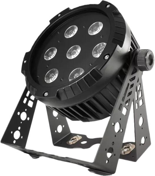 LED PAR 64 Alu spotlámpa hét diódával, 70W összteljesítménnyel. Megnövekedett páratartalom melletti működésre tervezték, ellenáll a pornak és az esőnek. A ház tömítettsége IP65-ös besorolású, amely lehetővé teszi szabadtéri rendezvényeken vagy építészeti világításként történő használatát a sérüléstől való félelem nélkül. A passzív hűtőrendszer (nincs ventilátor) tökéletes megoldást nyújt olyan helyeken is, ahol teljesen csendes világításra van szükség. Szállítási idő:Rendelésre