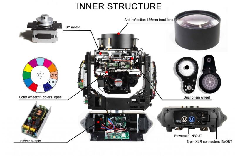 Robotlámpa, Beam, OSRAM 230 Watt - Prizmák: 16 fazettás+24 fazettás - Fényforrás: OSRAM 7R fémhalogén izzó (2000 óra) - 3 fázisú Pan/Tilt motorok - Nyitásszög: 2,5° - Tükröződésmentes 136 mm-es elülső lencsék - DMX csatornák száma: 14/16 - 11 szín - 16 gobó - Frost szűrő - Motoros fókusz közelről távolra (2.5M-30M) - Súly: 13.2kg