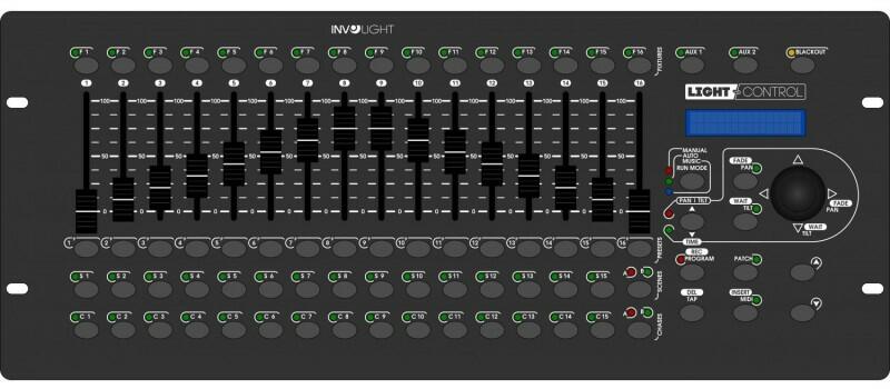 Fényvezérlő, DMX 512, 16ch - 16 DMX fader - Joystick: PAN/TILT mozgáshoz - 30 programozható Scene - 30 programozható Chases, darabonként 200 Scene,  maximum 1500 Scene - Blackout-function. - USB port a megírt programok mentésére és visszatöltésére - LCD display (2 x 16 karakter) - Táp: DC 9 / 12V, 300mA / min. - Méretek: 482x200x73mm. - Súly: 3kg