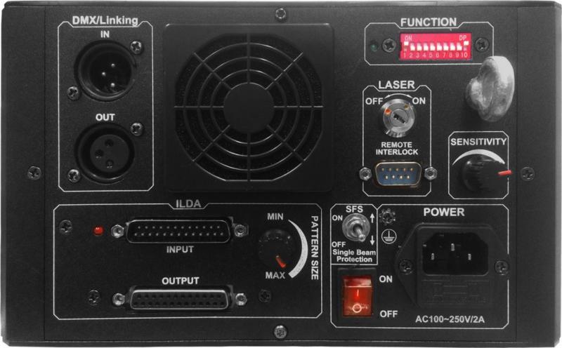 Lézer, RGB max. 1000mW, automata, hangvezérelt, DMX, ILDA, Galvo 30k Nagyteljesítményű, fél-profi lézer, erőteljes effektekkel – például beam, wave és tunnel – emellett alap grafikák megjelenítésének lehetőségével. A lézer plug & play üzembe helyezhető, rendelkezik hangvezérléssel (sound-to-light) és önálló (stand-alone) móddal. Támogatja a DMX vezérlést, így vezérelhető a többi fénytechnikai eszközzel együtt és mindemellett rendelkezik különálló ILDA porttal, így számítógéppel is összeköthető. Működtethető master-slave módban. Ajánlott kisebb és közepes méretű klubhelyiségekbe, beltéri eseményekre és mobil DJ-k előadásaira. Terméktulajdonságok: - 1W RGB lézer - DMX vezérlés és Master-slave mód támogatása - ILDA vezérlés számítógépről - Stand-alone működés - Zene általi vezérlés (Sound-to-light mode) - Lézernyaláb takaró lemez - Alap grafikák, szövegek és logók vetítése - Többszáz szín, a fehéret beleértve - 28 kpps@ 8° ILDA scannerek - 360°-ban elforgatható falitartóTechnikai adatok - Maximális teljesítmény: 1000 mW - Garantált teljesítmény: 8000 mW - Piros dióda specifikáció: 200 mW / 650 nm - Zöld dióda specifikáció: 70 mW / 520 nm - Kék dióda specifikáció: 530 mW / 450 nm - Nyaláb specifikáció: kb. 3 mm / 1,1 mrad - Scanner: 28 kpps@8°; ILDA - Max. lesugárzási szög: 40° - Lézer típusa: Dióda - Lézer osztály: 4 - Működési módok: DMX, stand-alone, sound-to-light, ILDA, Master-slave - Alap minták: kb. 130 (layer, tunnel, fence, wave stb. ) - Tartozékok: tápkábel, felhasználói kézikönyv, interlock, biztonsági kulcs - Tápellátás: 85 V - 250 V AC - Fogyasztás: 20 W - Méretek: 220 x 150 x 116 mm - Tömeg: 2,5 kg