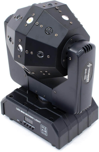 A Thunder MHD-108SL robotlámpa összesen 20 db LED-el rendelkezik, melyből 4 db piros, 4 db zöld, 4 db kék, 4 db fehér, és 2-2 db zöld és piros lézer, valamint 4 db extra erős fehér színű stroboszkóp LED. A mozgó party és hangulatmegvilágítás kedvező áru alapkelléke. A LED technológia előnyei a kis elektromos fogyasztás és tömeg, a hosszú élettartam és az alacsony hőtermelés. DMX vezérléssel és akár több lámpa sorbakötésével kihozhatja a maximumot a lámpából. Kedvező árú termék, könnyen szállítható és könnyen felszerelhető, üzembehelyezhető. A változtatható és mozgó megvilágítás bármilyen felhasználásra alkalmas a karaoke és házibuliktól a disco és dekorációs célokig is kiváló megoldás.